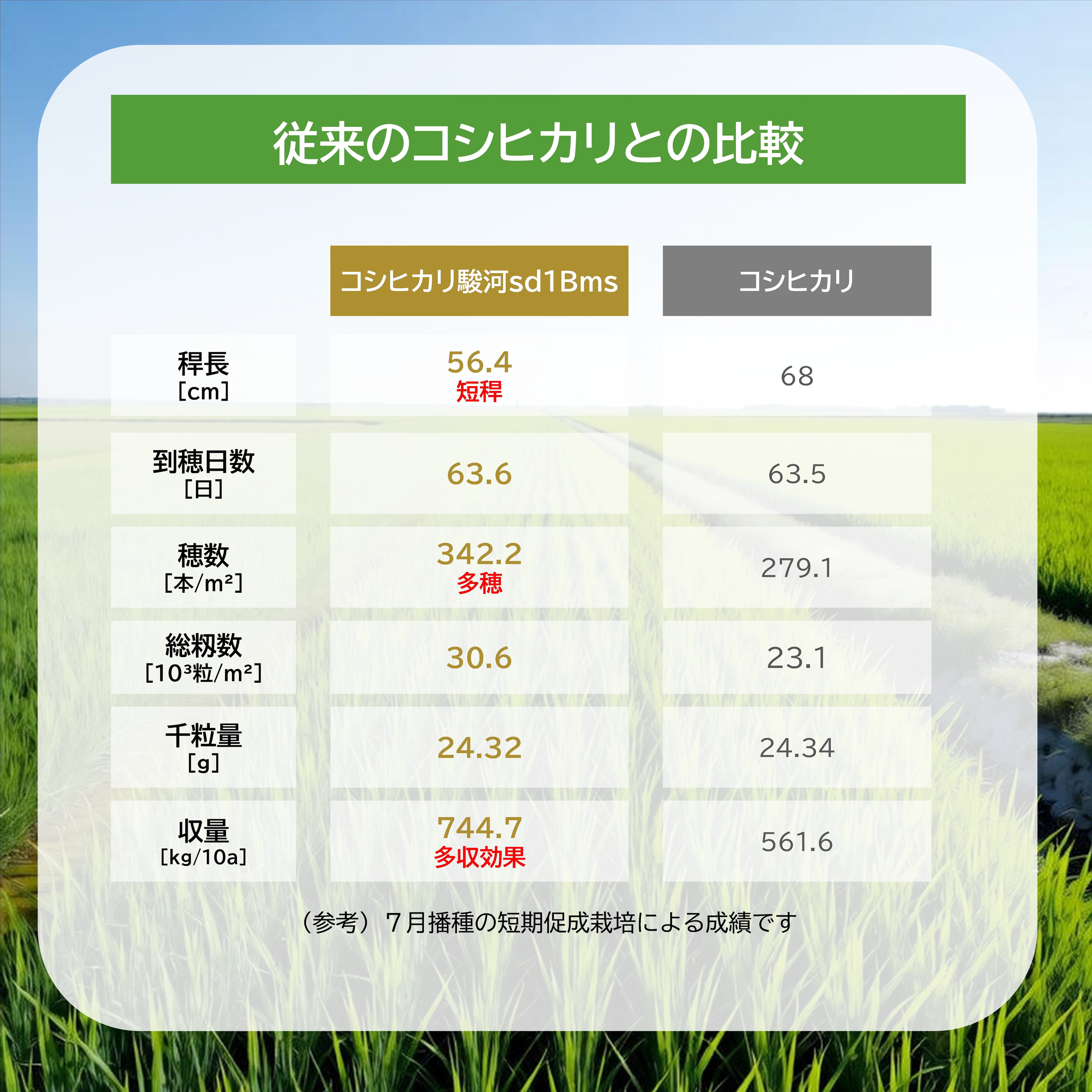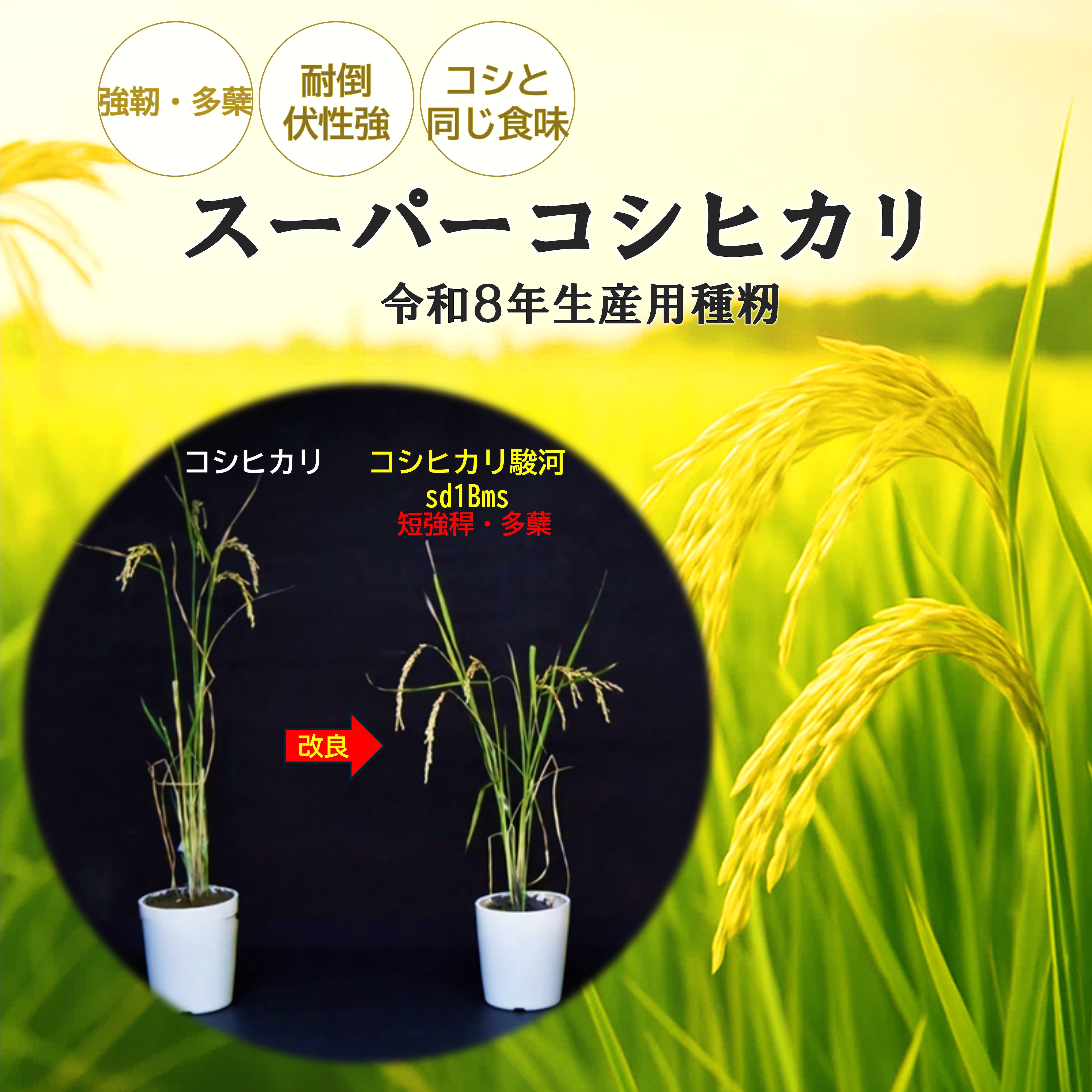 「コシヒカリ駿河sd1Bms」は、「コシヒカリ」の遺伝的背景で背丈を短くする短稈遺伝子sd1と強稈・多蘖化するバイオマス増大遺伝子Bmsを組み合わせた同意質遺伝子系統であり、「コシヒカリ」よりも短稈・強靭で、穂数が増加して多収効果を持つスーパーコシヒカリです。